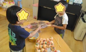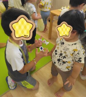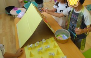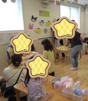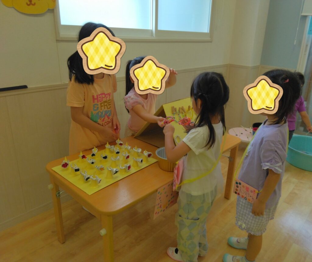 お客さん役の子ども達は、お金を入れた財布を首から下げて好きなお店を回りました。お客さん役の子ども達も自分から「オススメありますか?」や「3個ください」などと、積極的に発言し、やり取りを楽しむことができていました😄