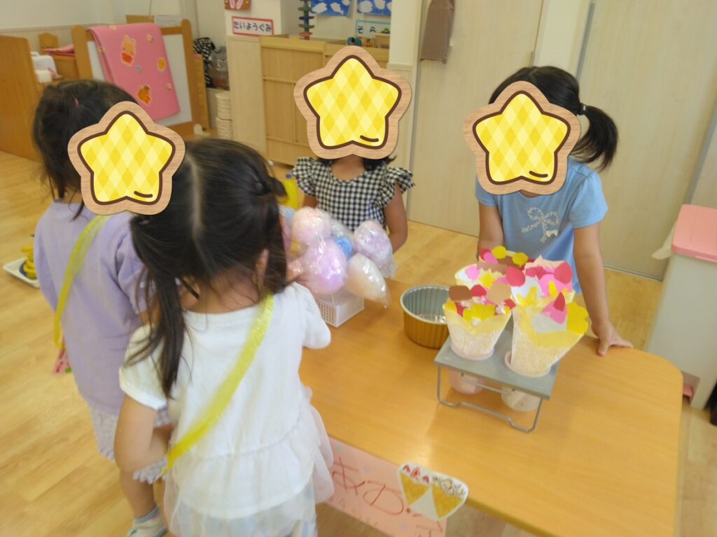 保育参加を前に、他クラスにも声をかけて園内でお店屋さんごっこをしました。幼児クラスの子ども達は、店員とお客さんに分かれて、交代しながらどちらも楽しみました🎶