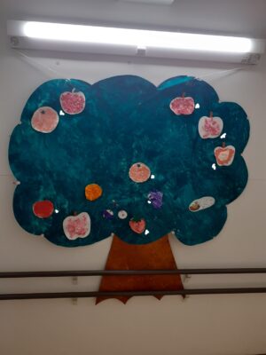 最後に、事前に子どもたちみんなで作った木に飾りつけし、‘’くだものの木‘’が完成しました🌳