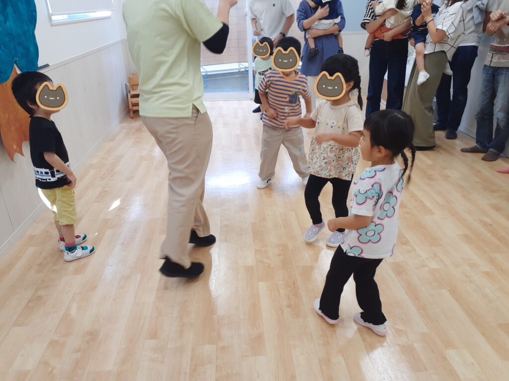 その後、くだものに関連する体操を行いました。ちょっぴり恥ずかしくて保護者と一緒に見ていた子もいましたが、踊っている子は保育者の振りつけを真似したりと楽しまれました☺