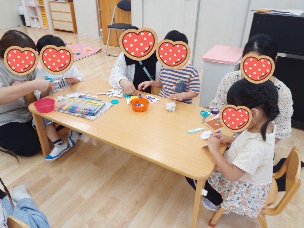 そして、くだものに関する製作も行いました。ひまわり組の子どもたちの個人マークが「いちご」「みかん」などの果物なので、個人マークの果物を作りました。折り紙・お花紙・クレパスなどの素材を使い、自分たちで作り方を考えながら進めていきました。