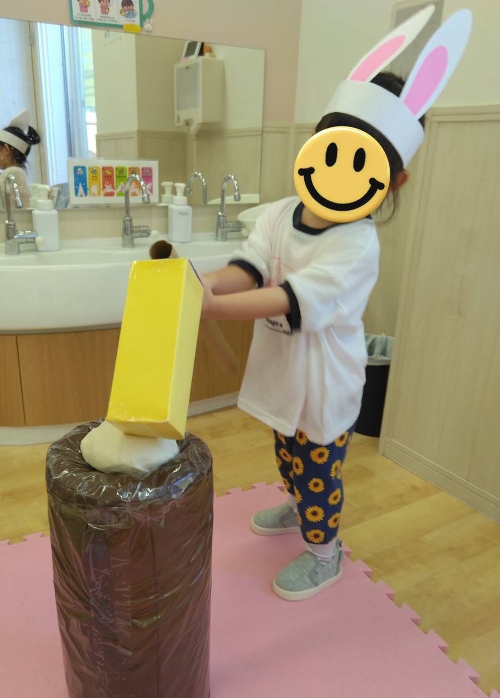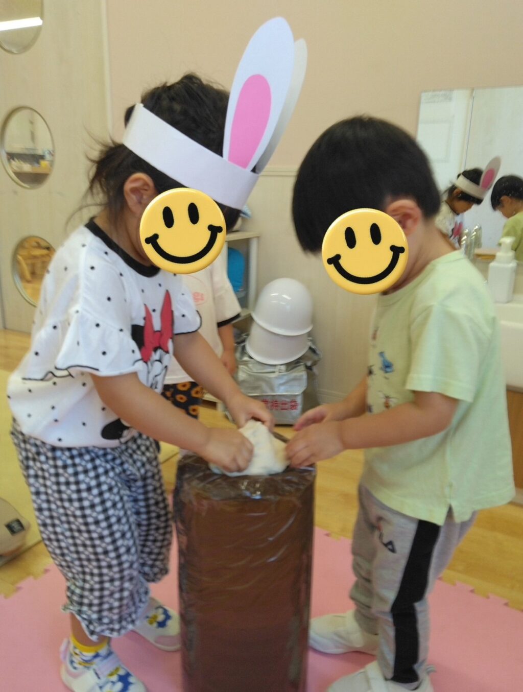 杵を握ってペッタンペッタンとお餅(粘土)をついたり、こねたりしてお友達と力を合わせてお団子を作りました🍡