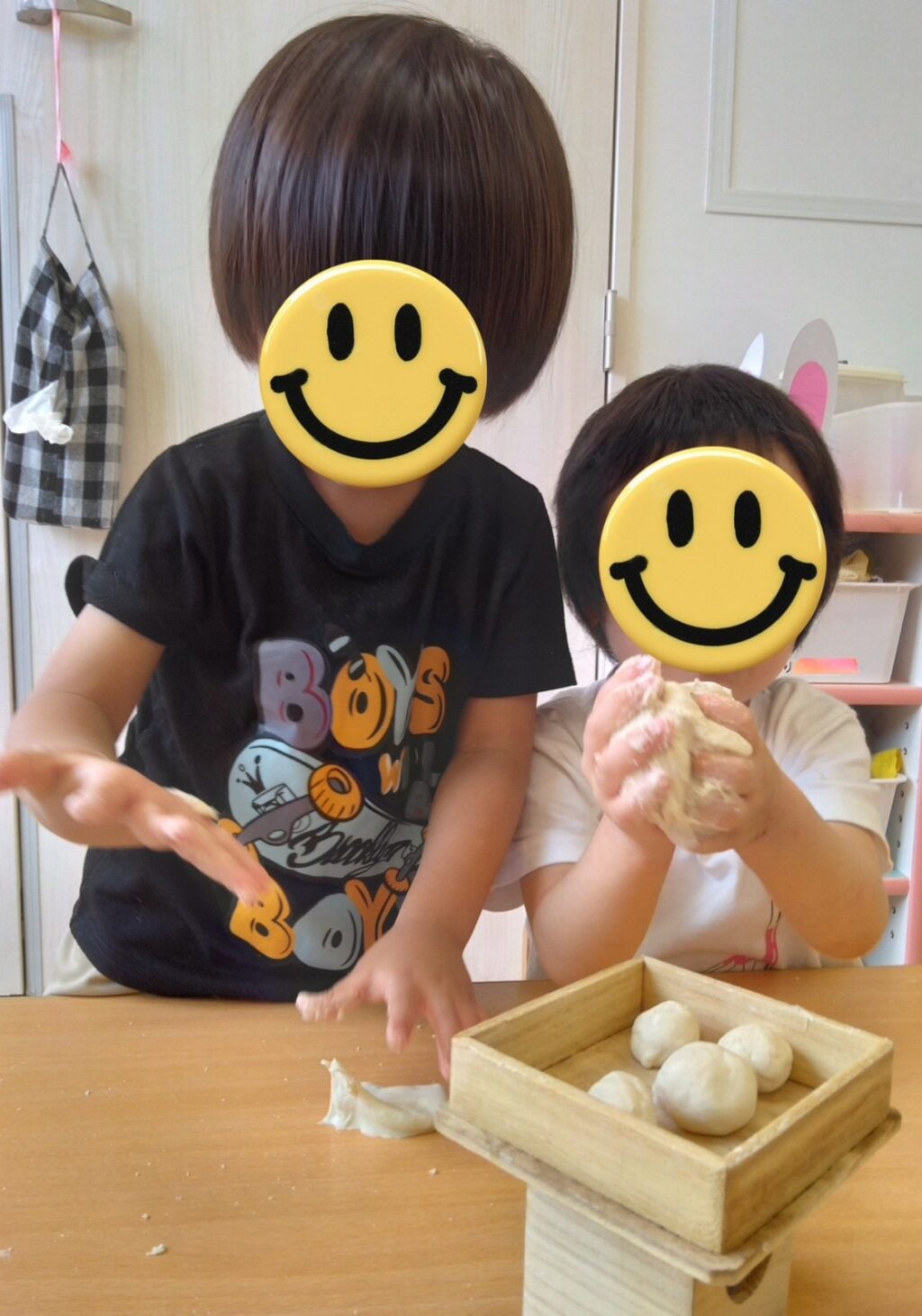 「真ん丸お月様(満月)をイメージして、丸い月見団子を作ろうね」と伝えると、両手を使って団子を丸く成形することに挑戦‼️整った丸い形にできる子もいれば、細長い形になってしまう子、何個も団子が合わさって塊になってしまう子…などなど、様々な形の団子が出来上がっていました🎵