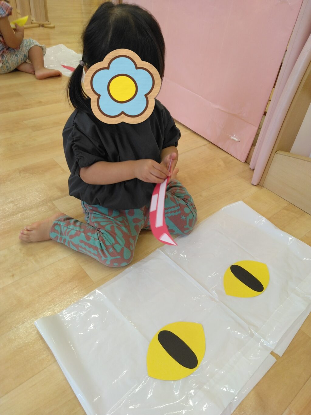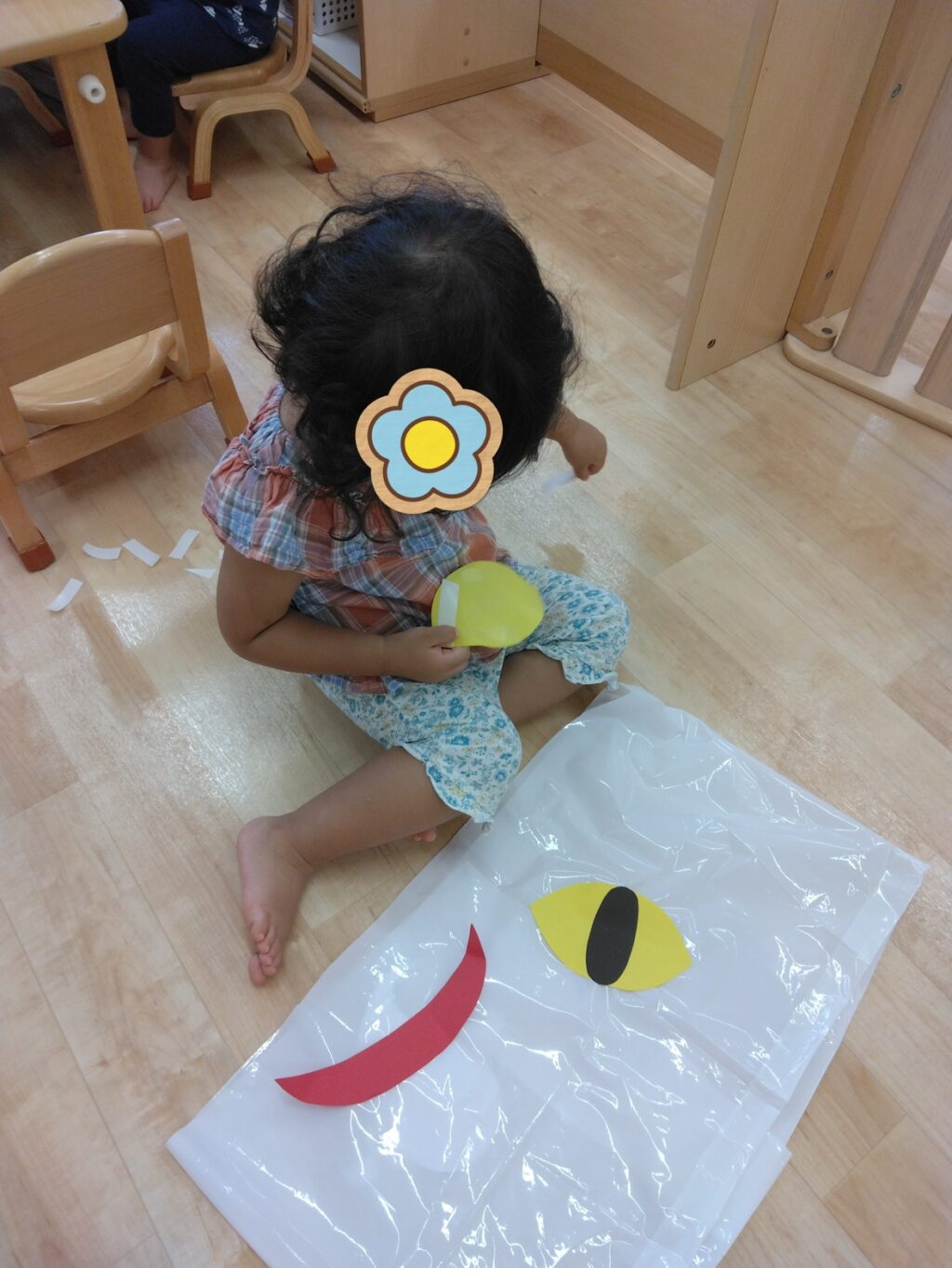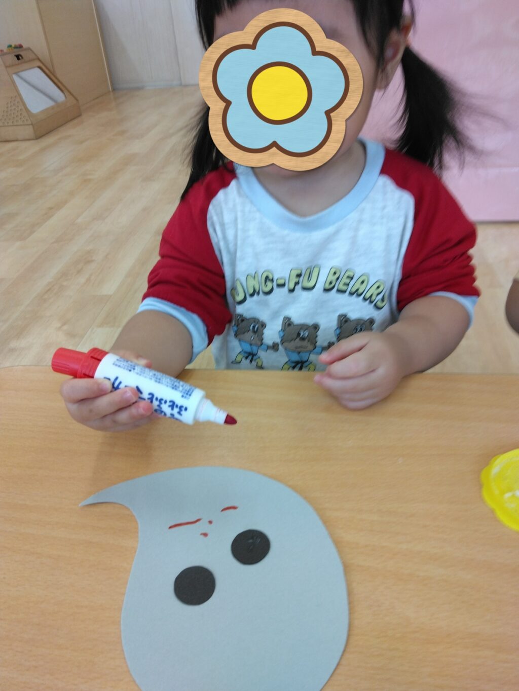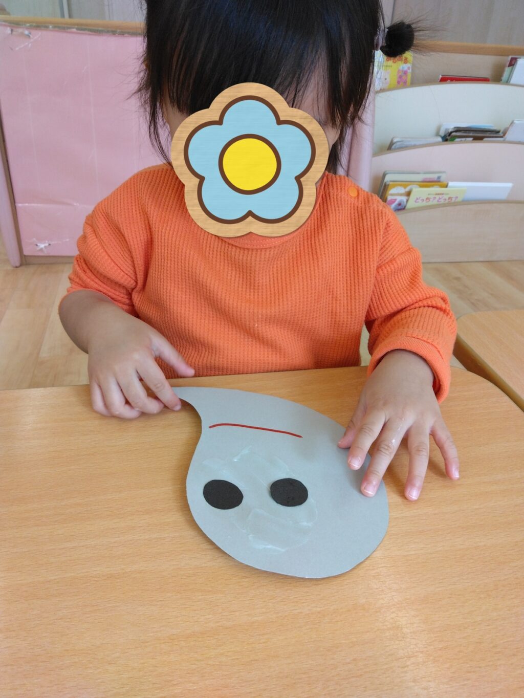 おばけの製作では、目を選んで貼り、おばけの口は自分でイメージして口を表現していました。「にっこり」「ぷんぷん」など、様々な子どもたちの描きたい口がイメージできていました。絵本の表情と見比べながら自分だけのおばけが完成!「これ!」と自分がつくった作品を指さし、とても印象に残っているようで、覚えていることが多いです!