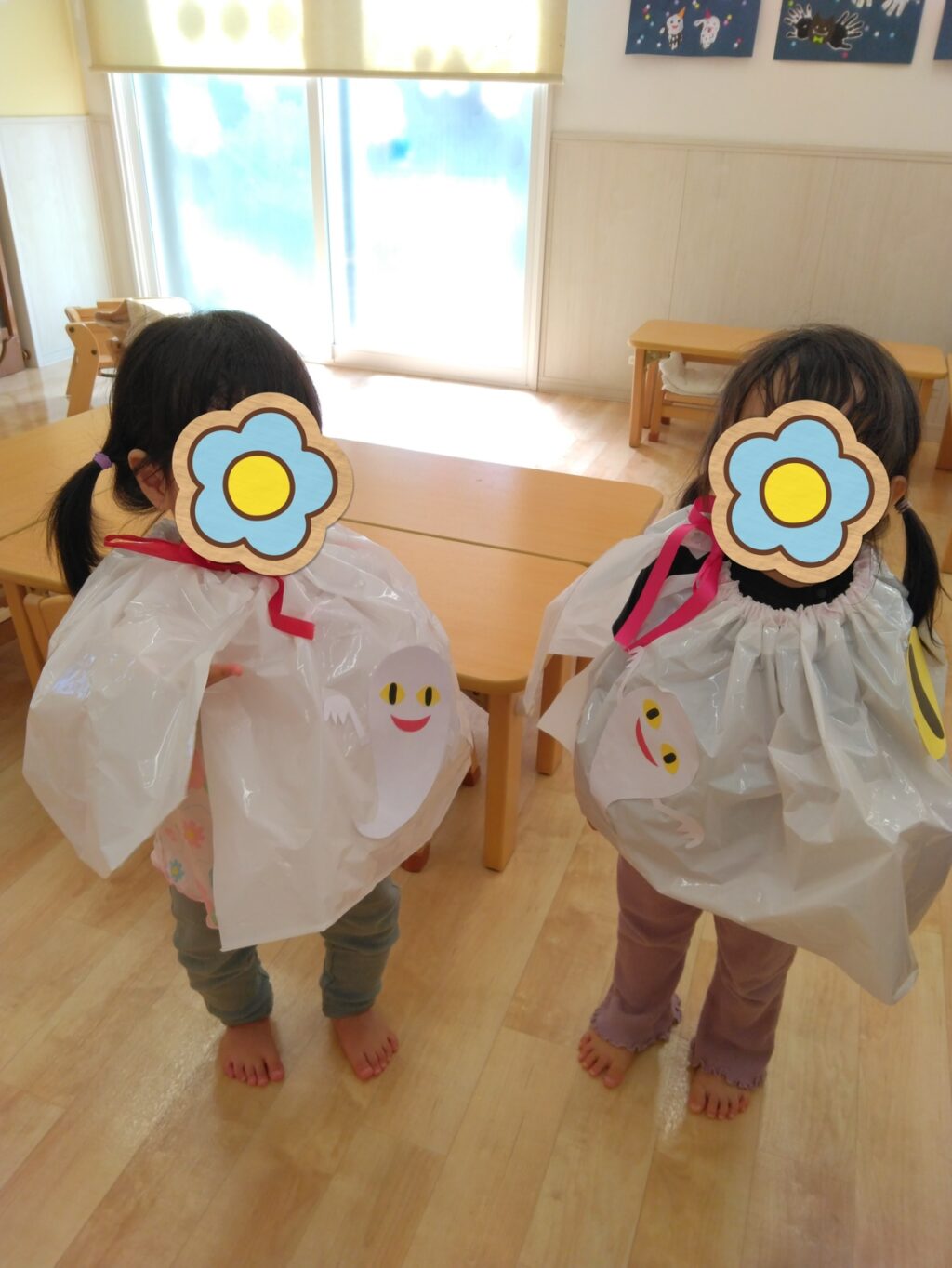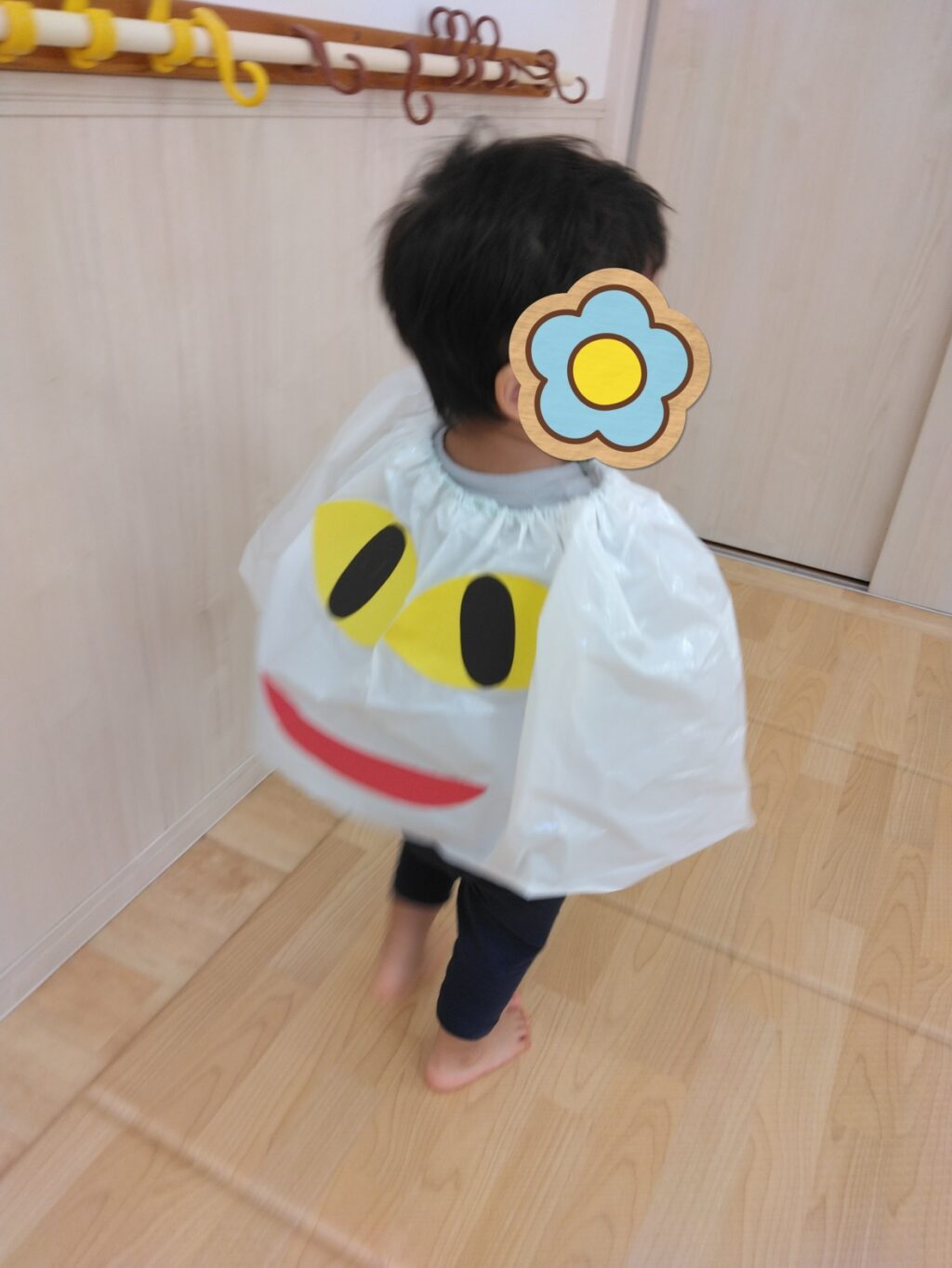 「ねないこだれだ」、「きれいなはこ」という絵本を知っていますか?黄色い目をしたおばけが出てきます。子どもたちはそのおばけが大好きで、毎日繰り返し絵本を読んでいます。ハロウィンの衣装はそんな大好きなおばけをイメージしたポンチョを作りました!おばけのワッペンを貼って、後ろには大きな目と口を自分の思う顔をイメージしながら貼りました!ポンチョを着るとおばけになった気持ちになり「おばけだぞ~!」と先生やお友達を驚かせていました☺
