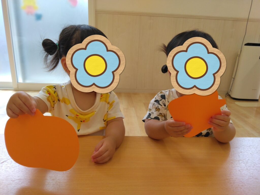ハロウィンってなに?まずは少しでもハロウィンについて楽しく知ることができるようにハロウィンの絵本を見ました。すると、かぼちゃやおばけに興味を持つようになりました!かぼちゃの形の画用紙を見るだけで大喜び!自分の知っているものってうれしい😊かぼちゃにパーツをつけて「ジャックオランタン」を作りました🎃部屋に飾るとすぐに友達と見せ合いっこが始まりました!
