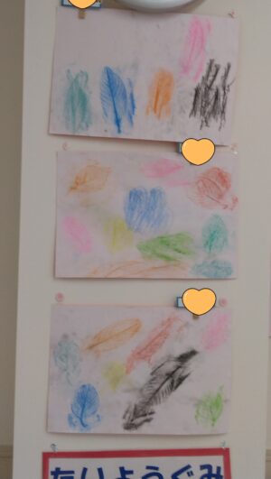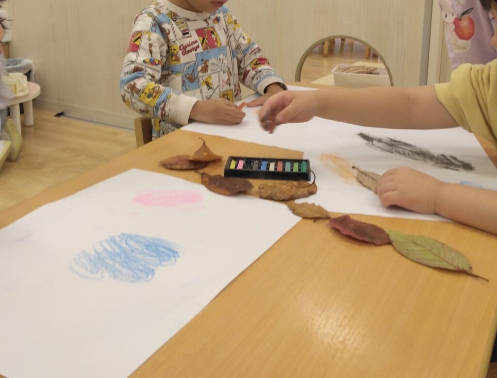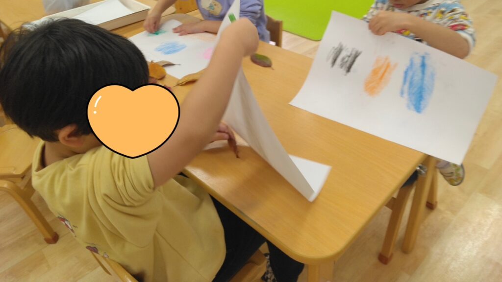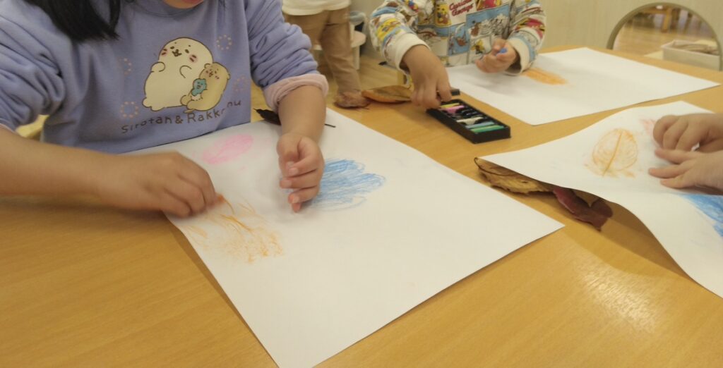赤や黄色に色づいた葉っぱを使って、パステルで擦りだしに挑戦✨擦りだしはフロッタージュといわれる技法のひとつで、凹凸のあるものの上に薄い紙を載せて、色鉛筆やパステルなどで擦り、模様や形を写し取るアートのことです。フロッタージュは初めてだったため、“どうなるの?”“どういう意味~?”と興味津々❗コピー用紙の下に葉っぱを敷き、その上をパステルで優しく擦ると、葉っぱの形が浮き上がってきて「すご~い」「面白い!」、「もっとやってみる!」と探求心が芽生えていました。