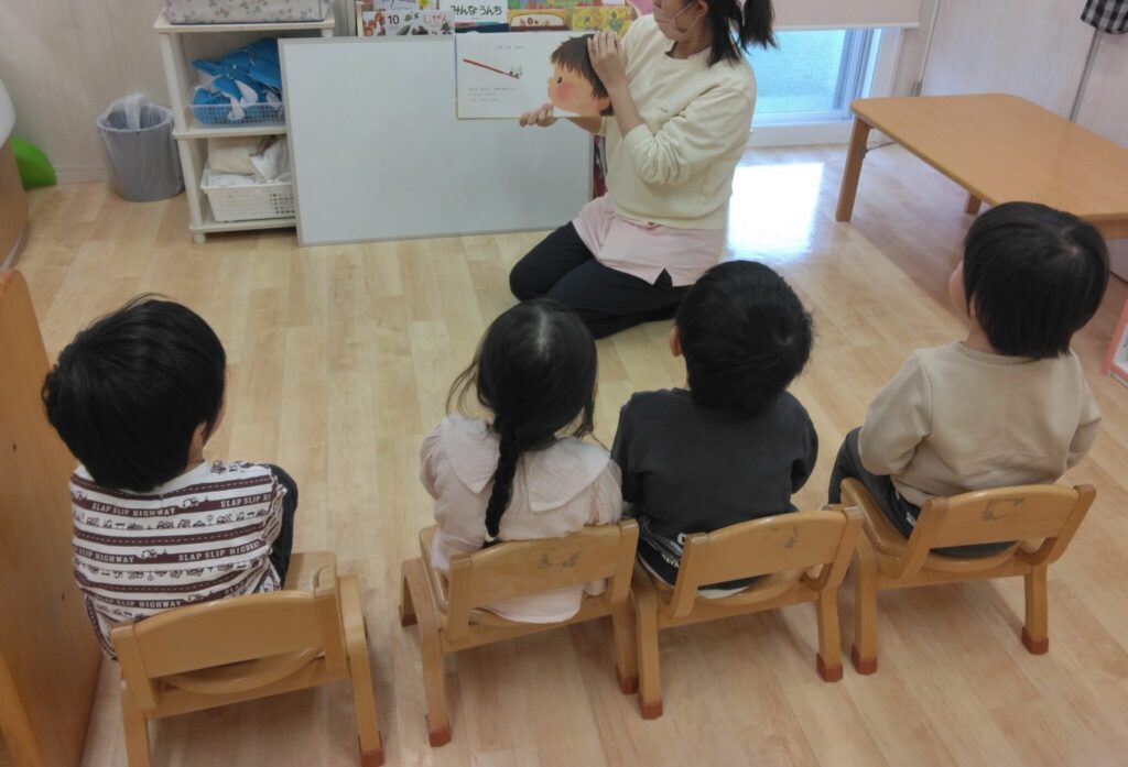 そして、電車と絵本が大好きなくろーばー組さんに向けて、「はみがきれっしゃ しゅっぱつしんこう」という絵本を読みました。みんな興味津々で、とても集中して見ていました👀
