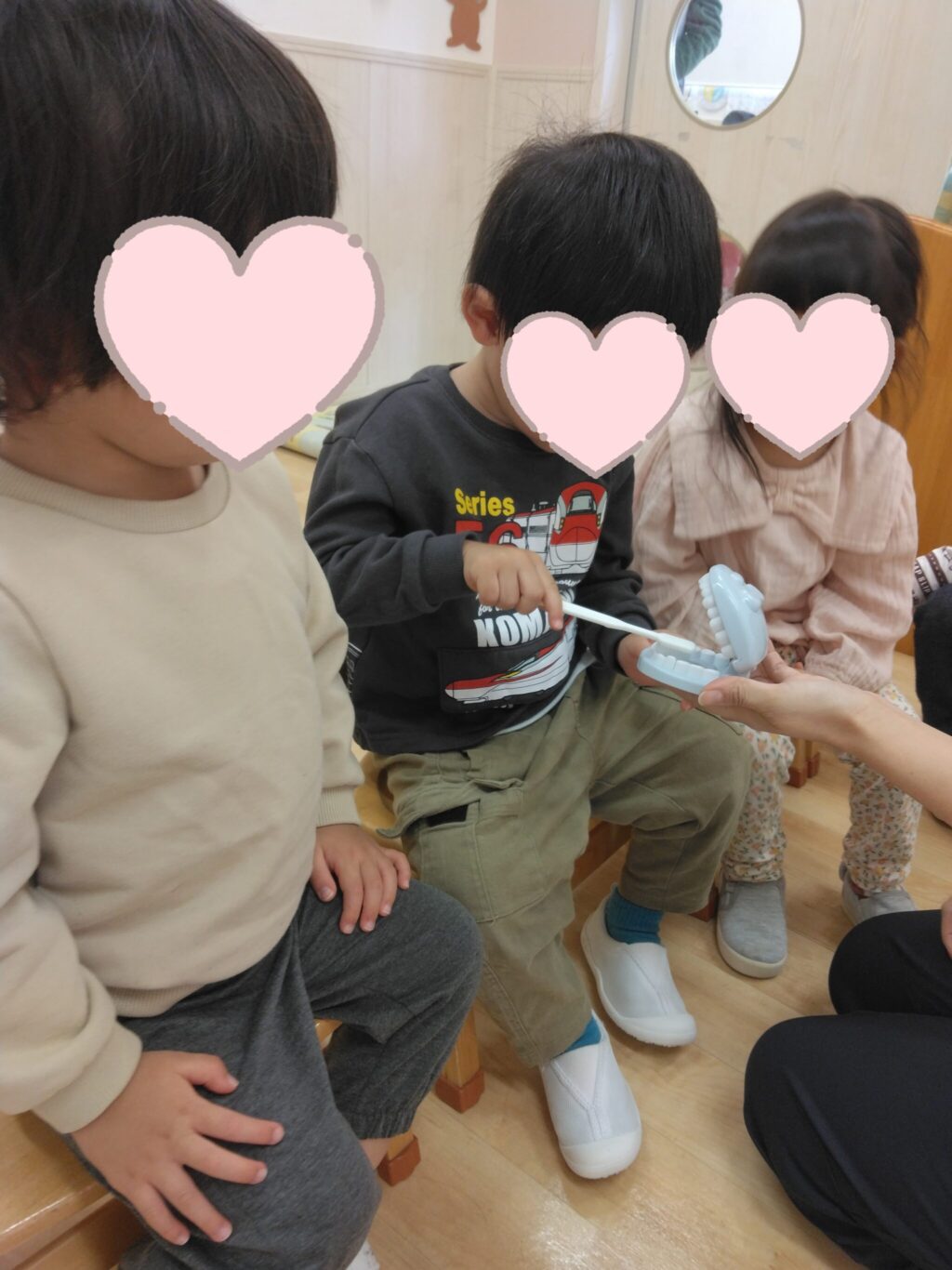 「歯ブラシで遊んだら危ないからダメだね。」「おもちゃゴシゴシもダメだね。」としっかりとお約束を理解してくれている様子でした😊