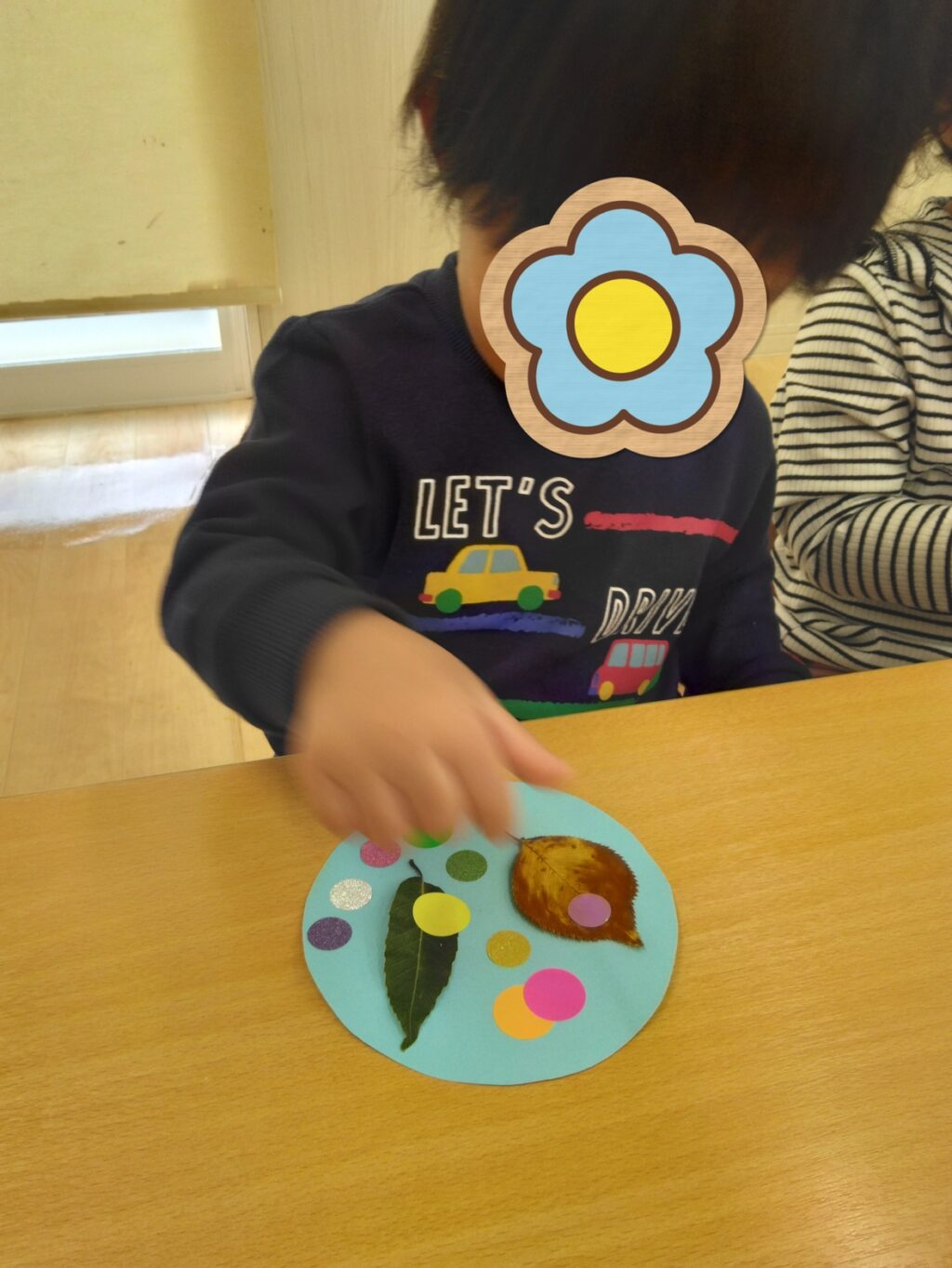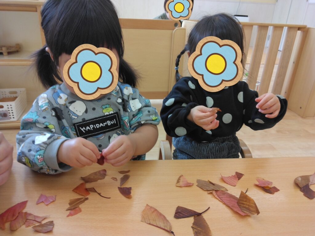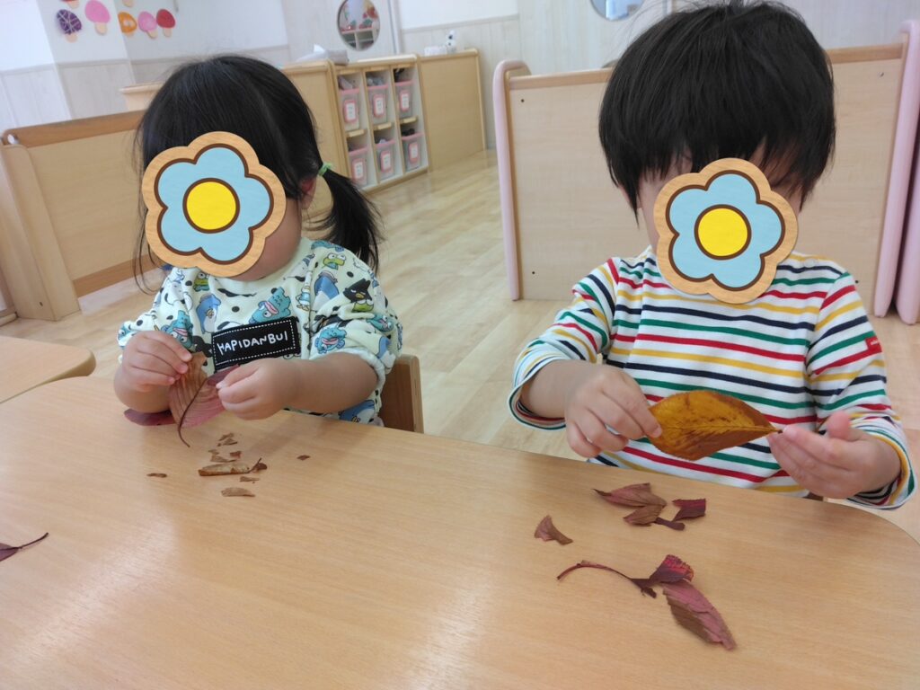 みんなで集めた落ち葉で遊びました!落ち葉の色や大きさなどに興味を持っていた子どもたち。びりびりと指先を使って落ち葉をちぎってみました。柔らかくて子どもたちの力でも簡単にちぎることができました🍂自分で好きな色や形の落ち葉を選び、台紙に貼って落ち葉の「しおり」を作りました!
