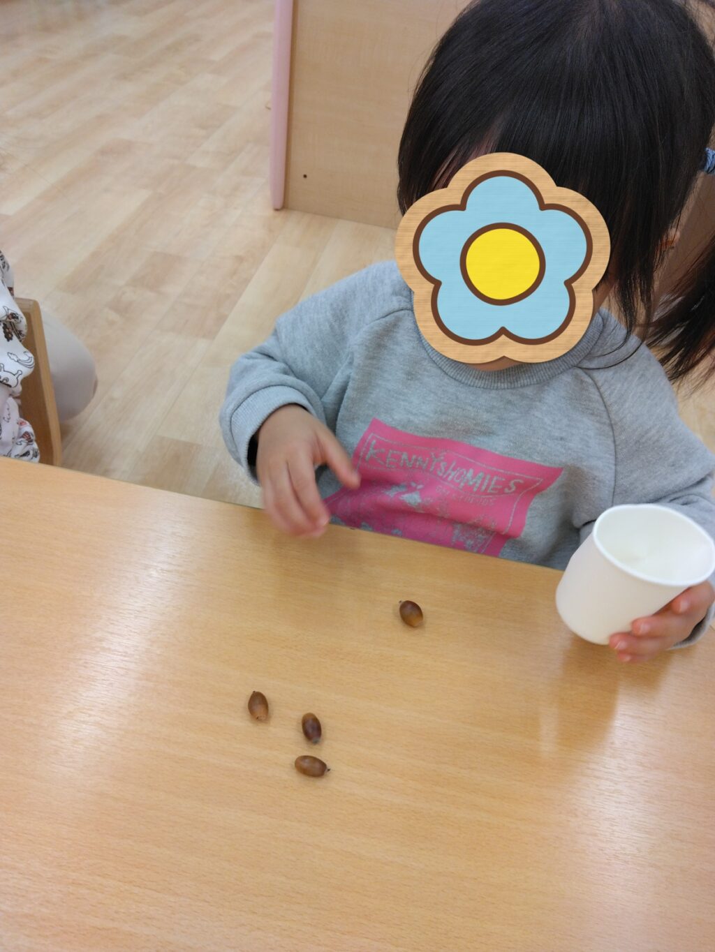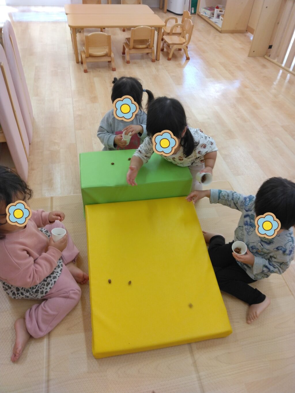 どんぐり遊びではじっくりどんぐりに触れて遊びました。だんだん慣れてくるとこまのようにしてくるくる回して遊んだり、手のひらいっぱいに集めたりして遊ぶ姿がありました。ソフトマットの坂道を使ってどんぐりの転がる動きを楽しみました✨「どんぐりころころ」の歌を歌いながら夢中になって転がして遊んでいましたよ🎶