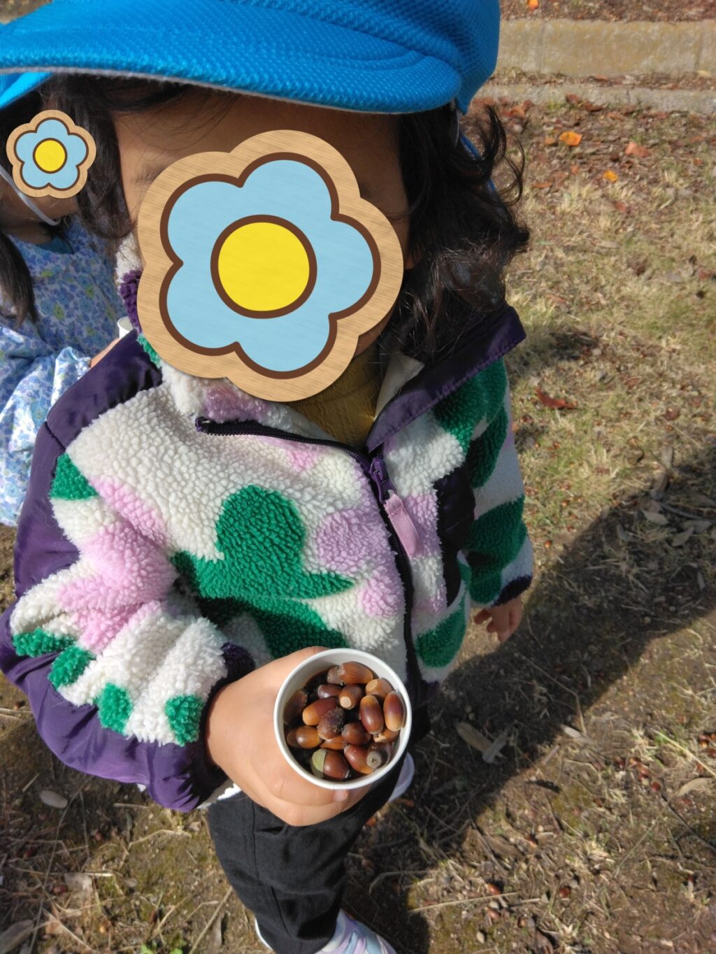 散歩へ行くだけでもとっても楽しいのですが、外に出て感じることや、触れられるものにはたくさん感じて、触れてほしい。子どもたちが見つけたものを共有し、見つけられた楽しい気持ちに共感しながら戸外で過ごすようにしています。落ち葉やどんぐりも拾うだけではなく、様々なあそびにつながっていくことを子どもたちに伝えていきたいと考えています。