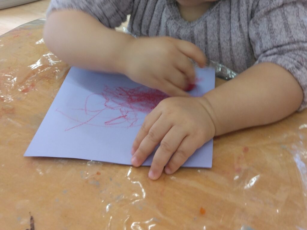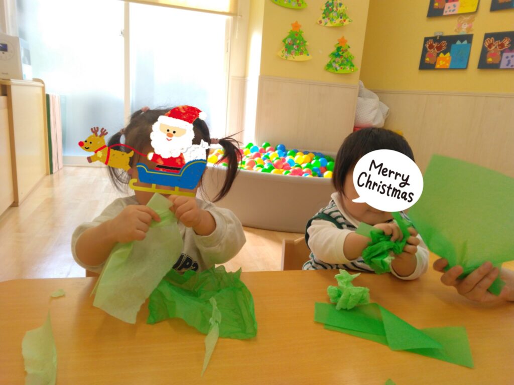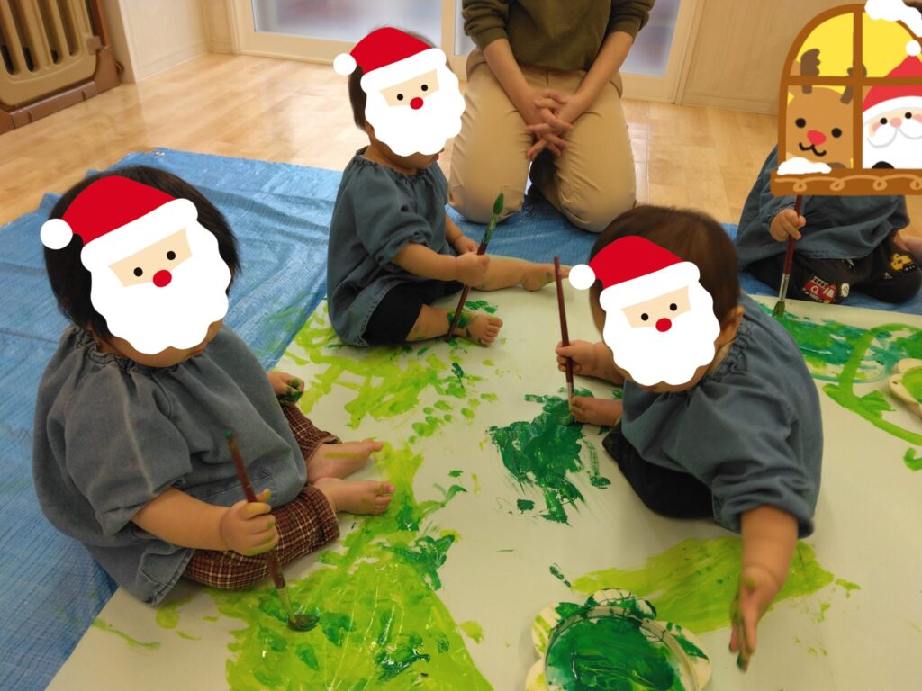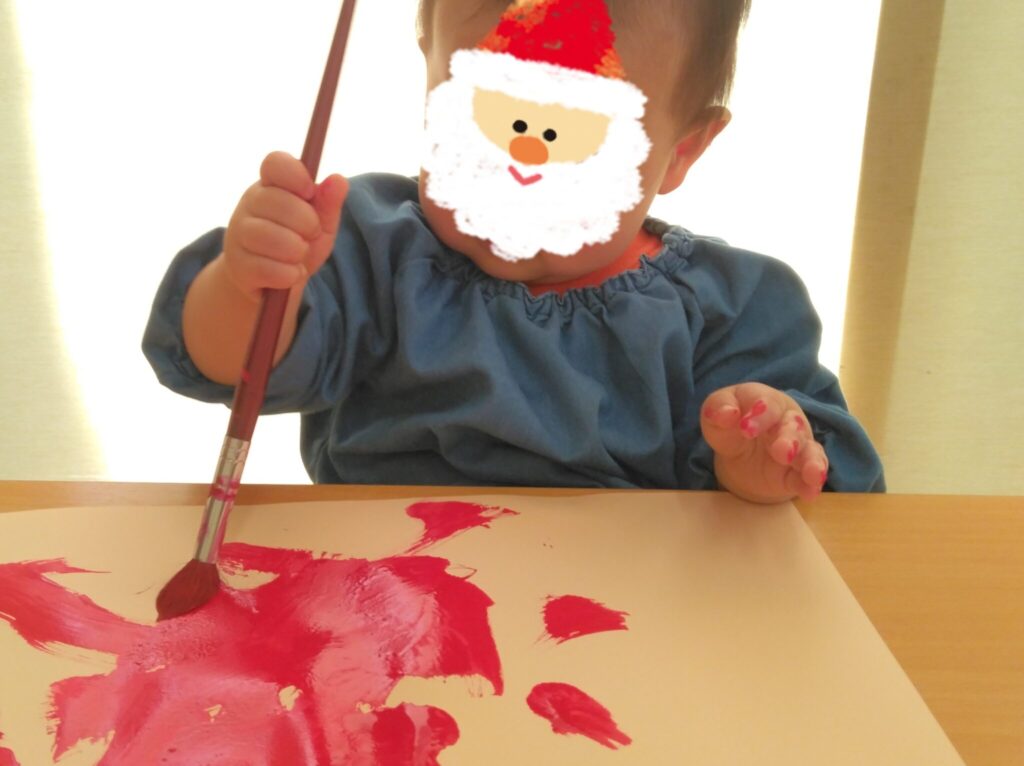 クレパスをしっかり握って点や線を描いて楽しんだり、手のひらに絵の具をつけて絵の具あそびをしたり、今までの経験を生かしてプレゼント🎁やサンタクロースのお顔🎅も作ることができました😃