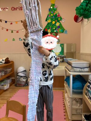 今回のマフラーづくりを通して、就学に向けて一定時間継続して取り組むこと、単発の活動にならず日を跨ぐ中で気持ちを繋いだまま取り組むことに挑戦する機会になったと思います。マフラーは取り組み続けることで、目に見えて長くなっていく様が分かるため、達成感や満足感を感じながら取り組みやすかったです。またやりたいと話していたため、次は少し細い毛糸や指編みにも挑戦できればと思います😄