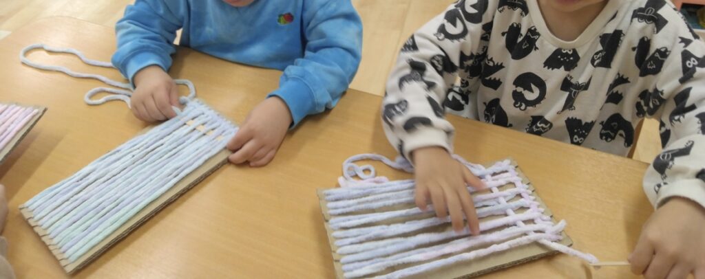 今回は段ボールを使い、機織りの要領で取り組みました。事前にある縦の毛糸ラインに沿って横から上下に毛糸を這わせて編んでいきます🪡やり方をすぐに理解して「簡単!」と進めていくことができました。