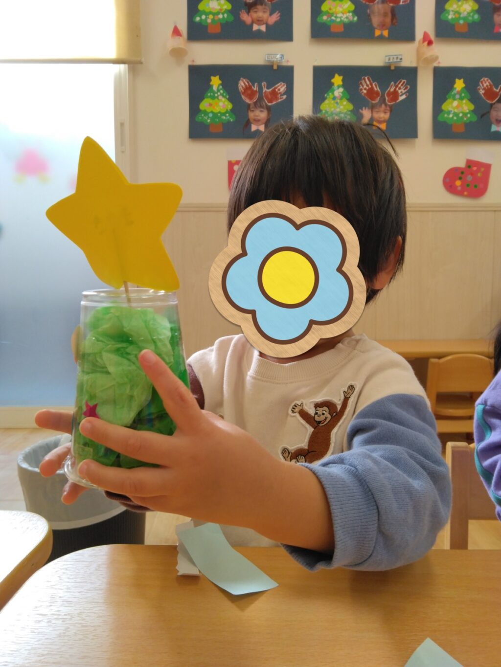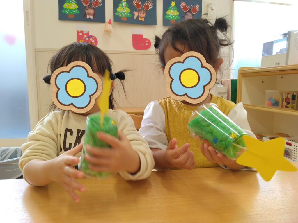 園の周りのイルミネーションや、きらきら光るツリーに興味津々の子どもたち。自分だけのツリーを作ってみよう!平面のツリーには指絵具で雪を表現しました❄立体のツリーでは、お花紙を詰めて、きらきらのシールでデコレーション☆てっぺんの星を飾るとき、特別感が感じられました!