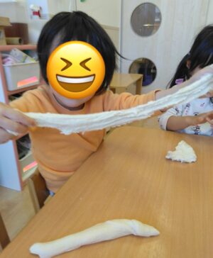 小さくちぎって真ん丸のお餅を作って並べ、「いらっしゃいませ~🧑🏻🍳」とお餅屋さんが開店したり、腕を広げてダイナミックに伸ばし、「みてみて~、ビヨ~ン💥」と大笑いする子も…🤣