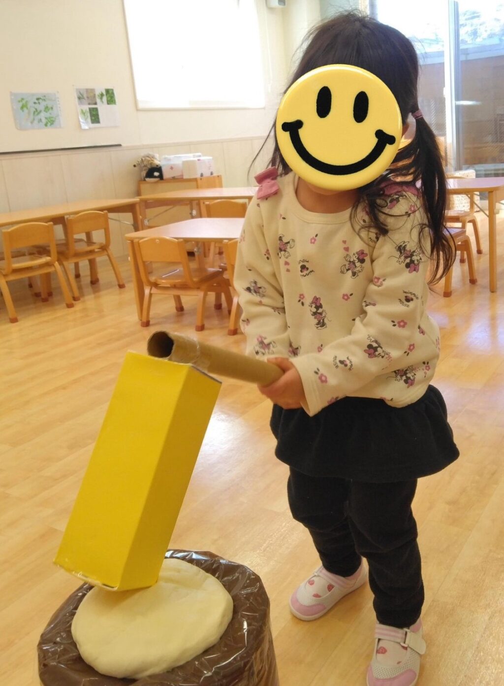 クラスでは、駒や羽根つき、凧揚げなど様々なお正月あそびを楽しみました。その中の一つに「お餅つき」を行ったので、ご紹介します👍🏻