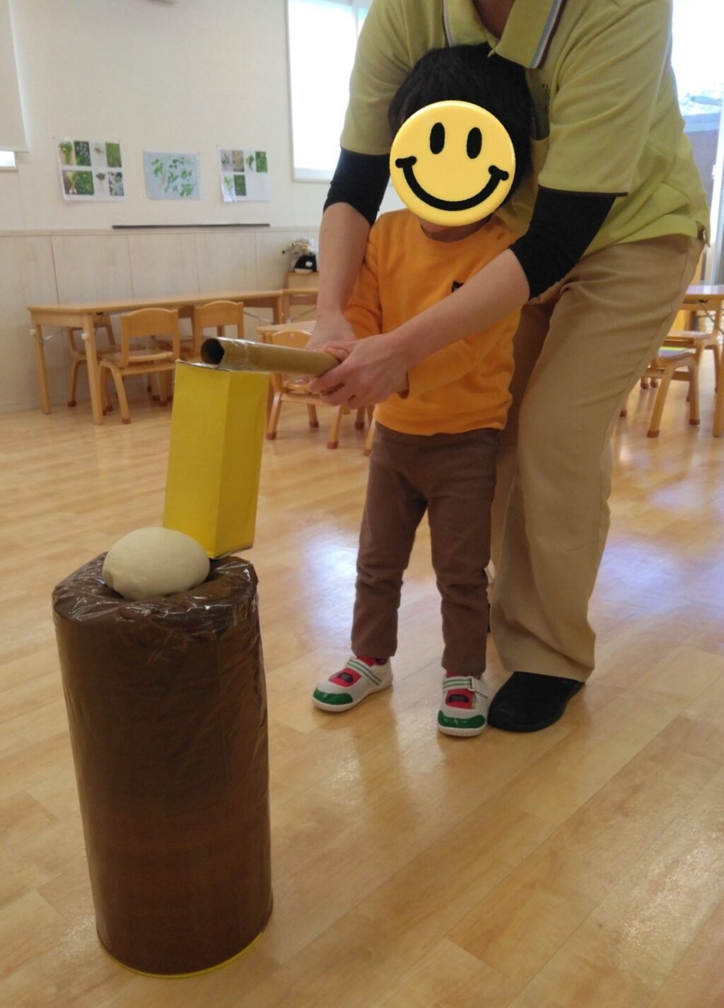杵を握り、「も~ちつき、ぺったんこ~🎵」とお餅の歌をうたいながらペタペタと餅をつく子ども達。先生と一緒に力強くつく子、自分だけの力で優しくつく子、などそれぞれの楽しみ方で取り組んでいました😄