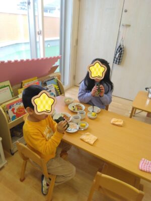 鬼を退治した後は、給食で恵方巻を食べました。恵方巻は自分達で巻きすを使って巻くところからやらせてもらいました。のりにご飯を薄く伸ばし、具も巻きやすい位置に調整して並べたため、全員きれいな恵方巻をつくることができていました✨