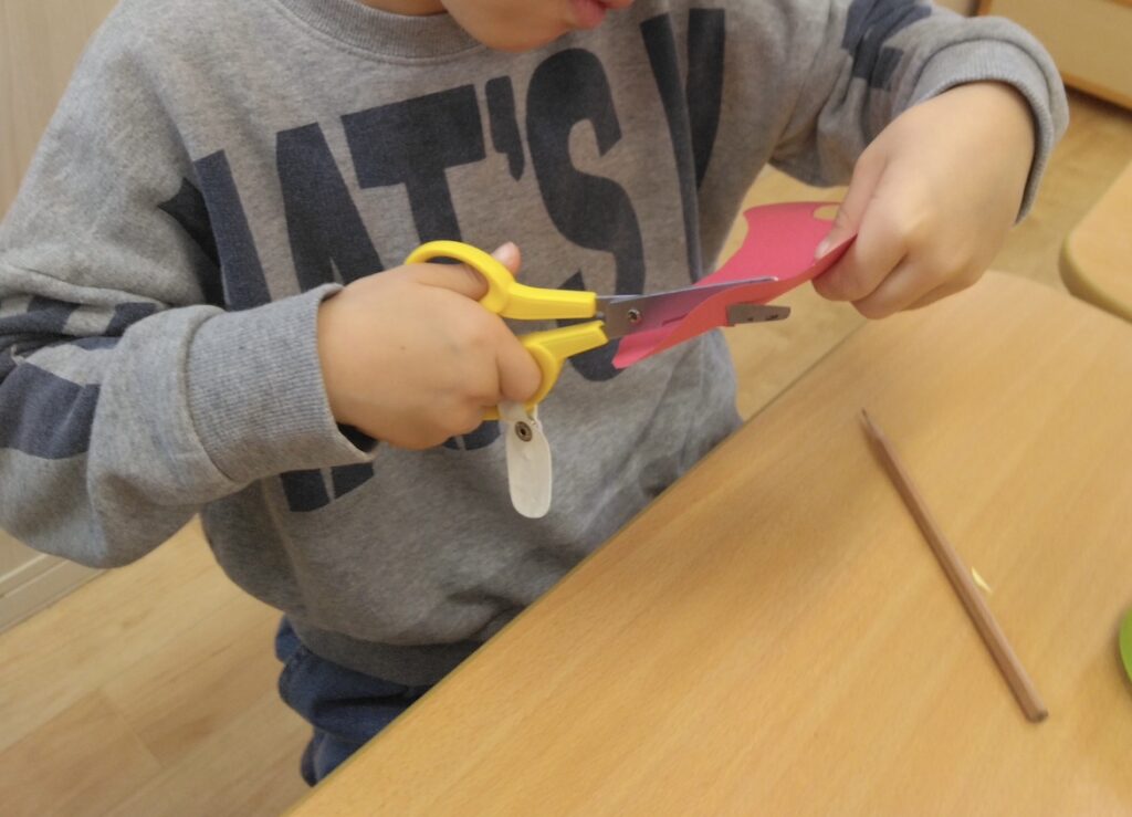 節分当日までに鬼のお面の製作を行いました。自分vs鬼ではなく、自分の中にいる悪い鬼をやっつけようということで、自分がつける鬼のお面をつくりました。顔に装着するお面ということで、初めて目の部分をくり抜いて切ることに挑戦❗まずは、自分の目に合わせて印をつけてから山折りで切り込みを入れて切っていきました。