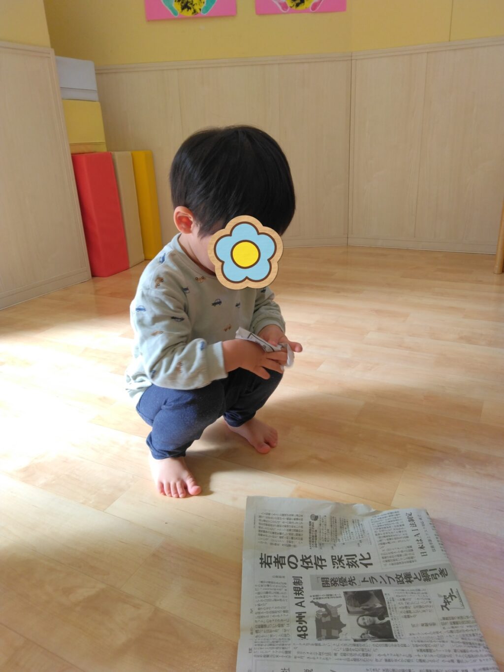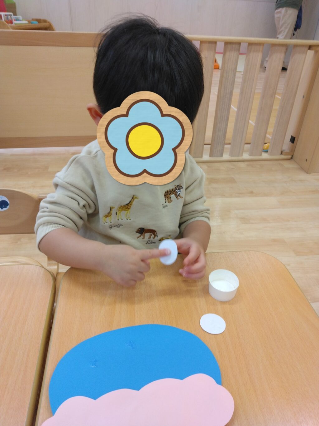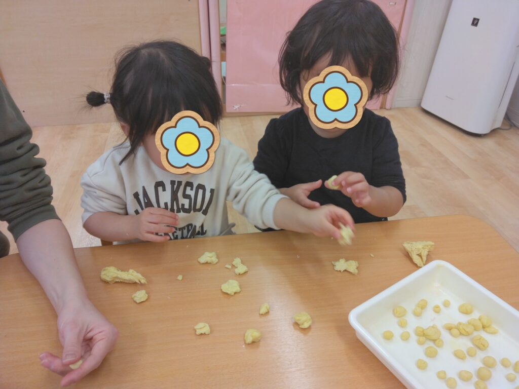 まずは新聞紙遊びで、たくさん丸めて新聞紙の豆つくりを楽しみました!作ってすぐに「おには~そと!」と新聞紙を投げていました!小麦粉粘土でも豆を作ってみました。黄色の食紅を少し入れてこねこね~丸めると本当の豆みたいでした✨