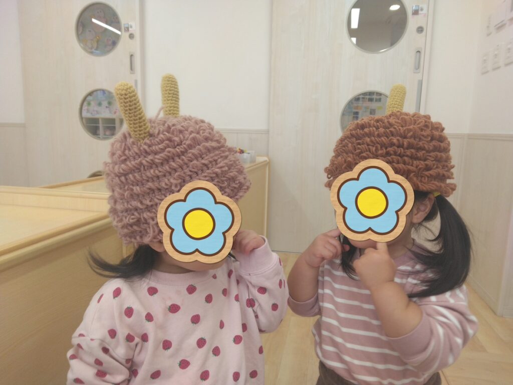 節分当日、鬼の帽子をかぶって鬼の気分を味わいました👹「かわいい~」とたくさん写真を撮ってもらえて子どもたちは大満足!鬼の的に向かって「おには~そと!」「ふくは~うち!」自分たちで作った豆をまきました。みんなで歌を歌ったり、絵本を見たり節分を知りながら楽しく過ごしました😊