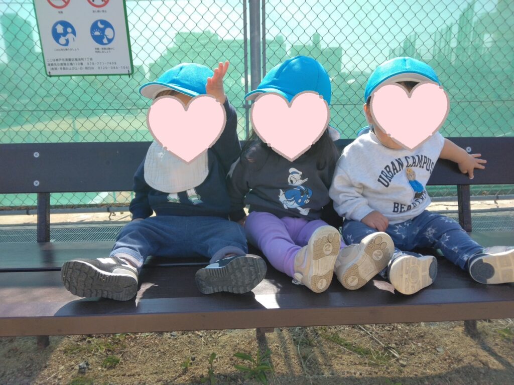公園にベンチがあったのでみんなで座って集合写真を撮りました📸一年間で大きく成長して上手に座れるようになり、公園のベンチでも少しの間なら上手に座れるようになりました!みんなと一緒だと嬉しくてニコニコの笑顔で写真を撮ることができました💓