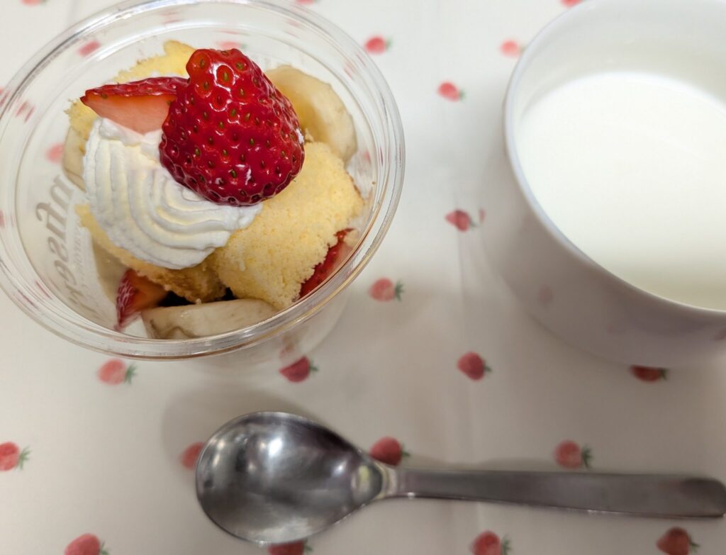 おやつは いちごヨーグルト、フライドポテト、ココアクッキーでした。