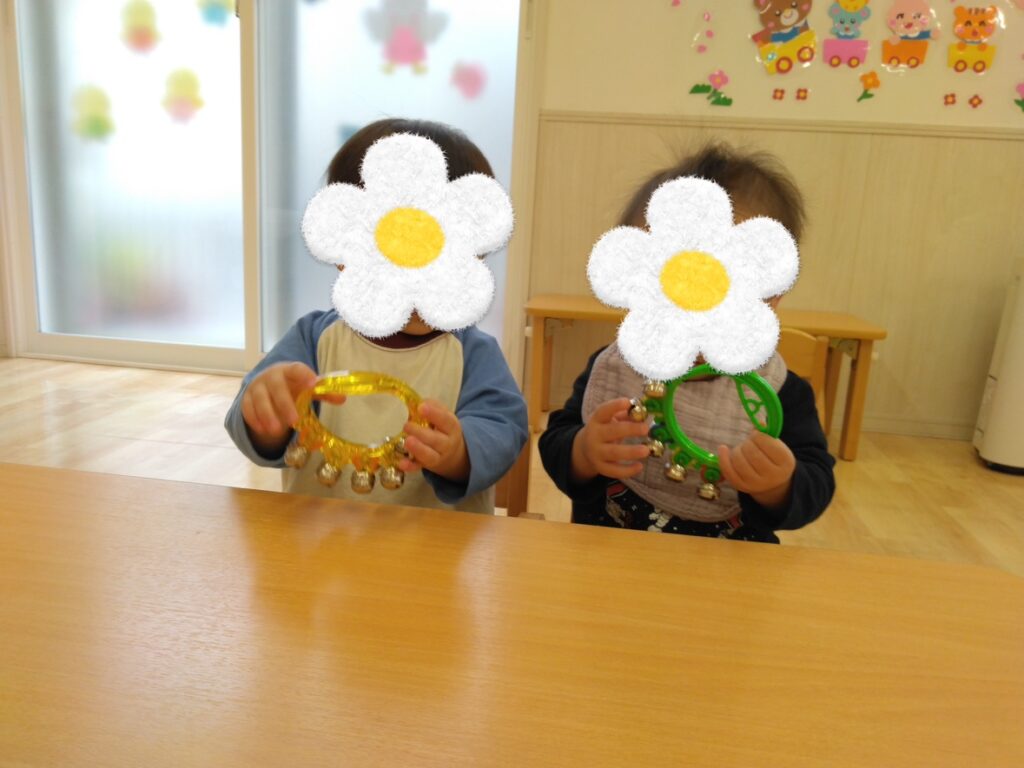 すずやタンバリンなど持ちやすい楽器に挑戦していっています。先生と同じように鳴らすことができると嬉しくて声をあげて笑いながら楽しめています♪