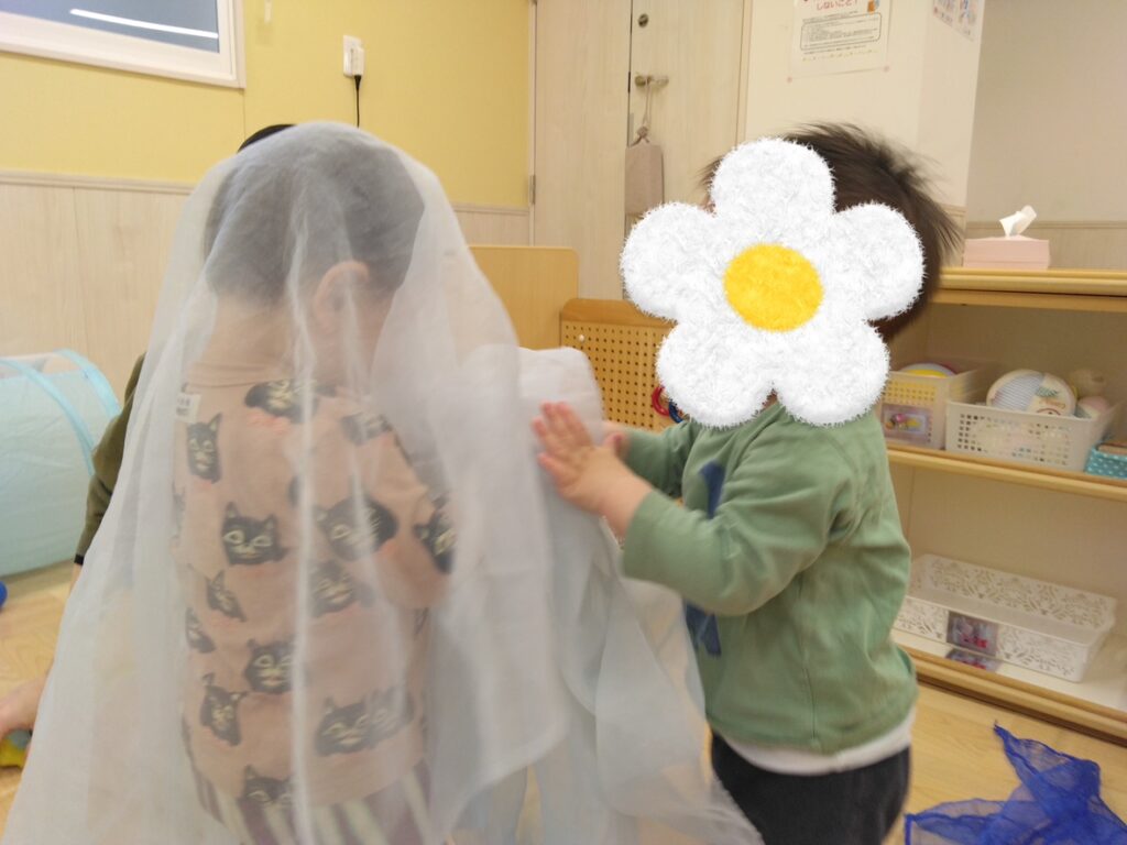 やわらかい布で「いないいないばあ」をしたりかくれんぼをしたりして遊ぶことが好きな子どもたち。お友達の布をそーっとめくってみるなどお友達との関わりも少しずつ増えていっています。
