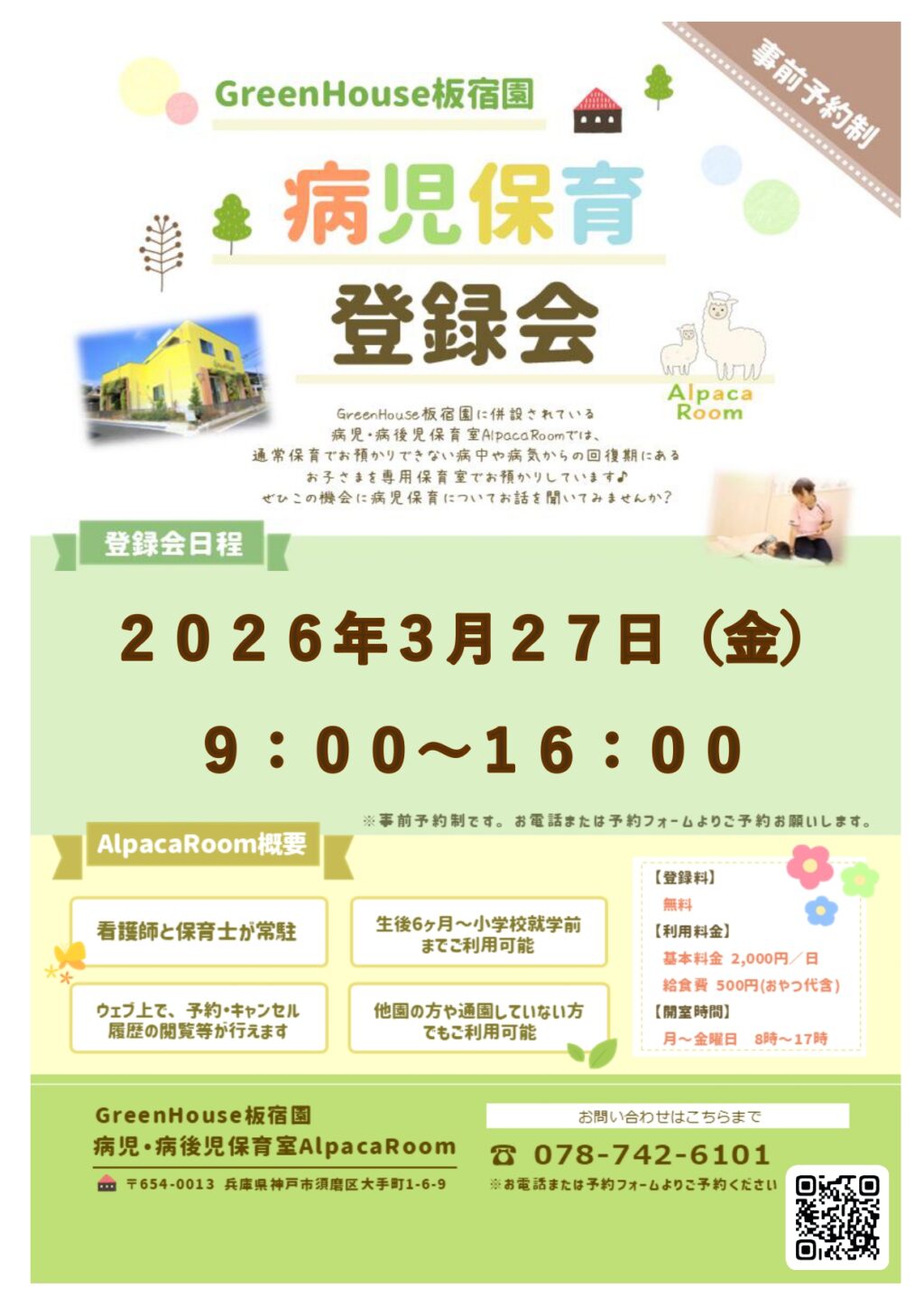 GreenHouse板宿園に併設されている、病児・病後児保育室Alpaca Roomでは、通常保育でお預かりできない病中や病気からの回復期にあるお子さまを専用保育室でお預かりしています🐻❄️🐰🐻
